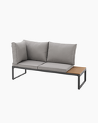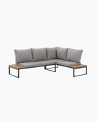 Contemporary outdoor corner sofa set featuring a sleek aluminium frame, wood-effect panels and plush grey cushions for stylish garden living.