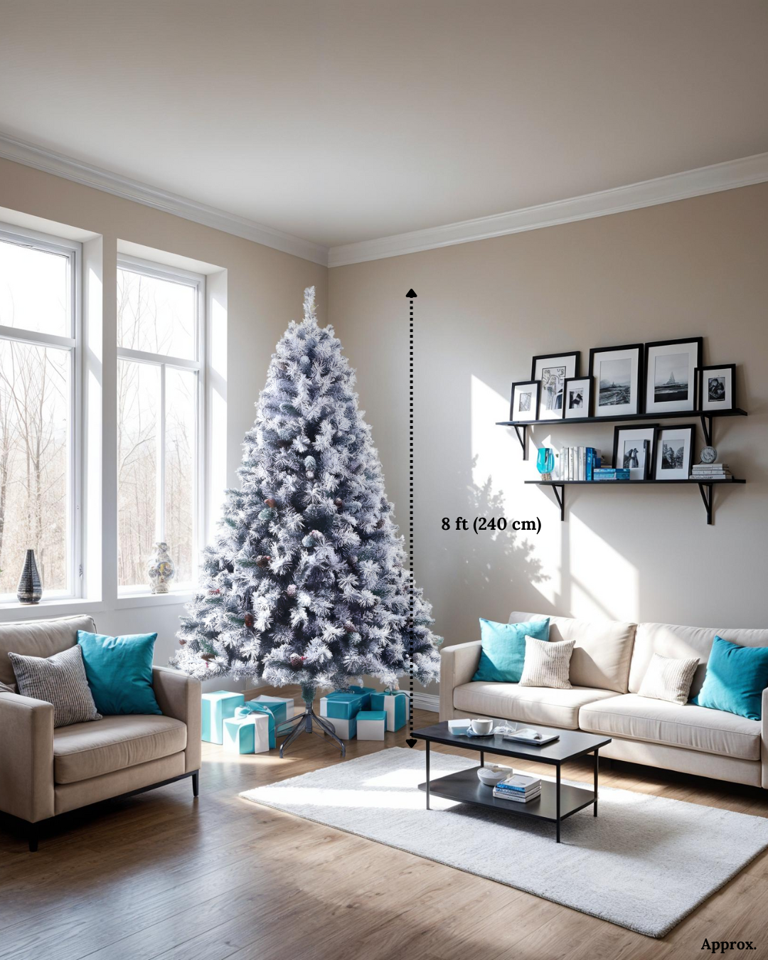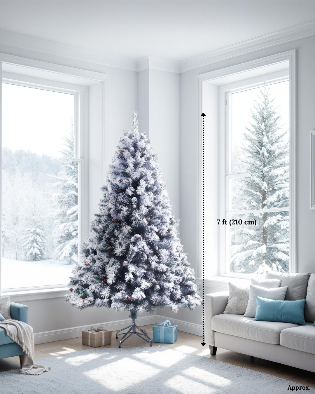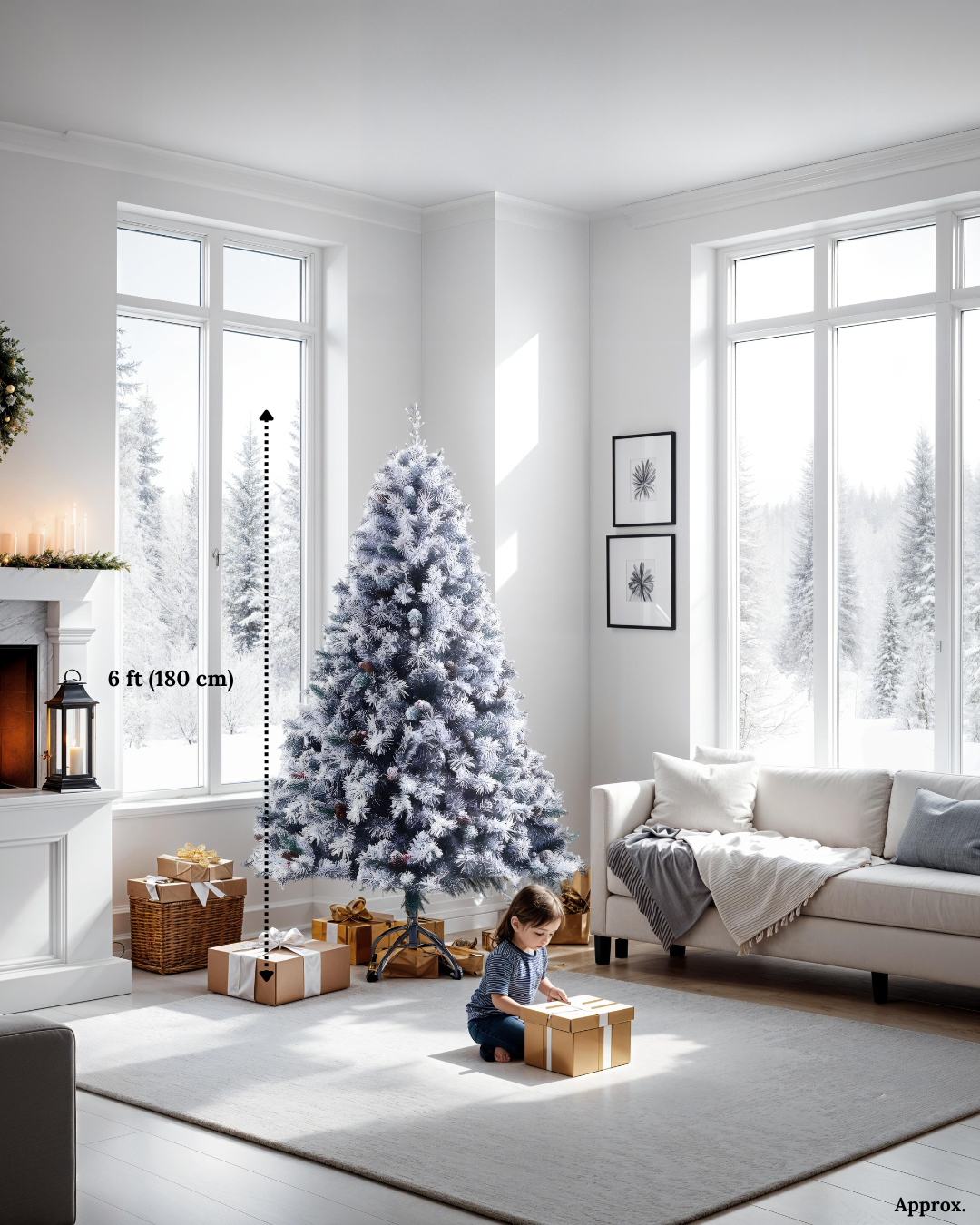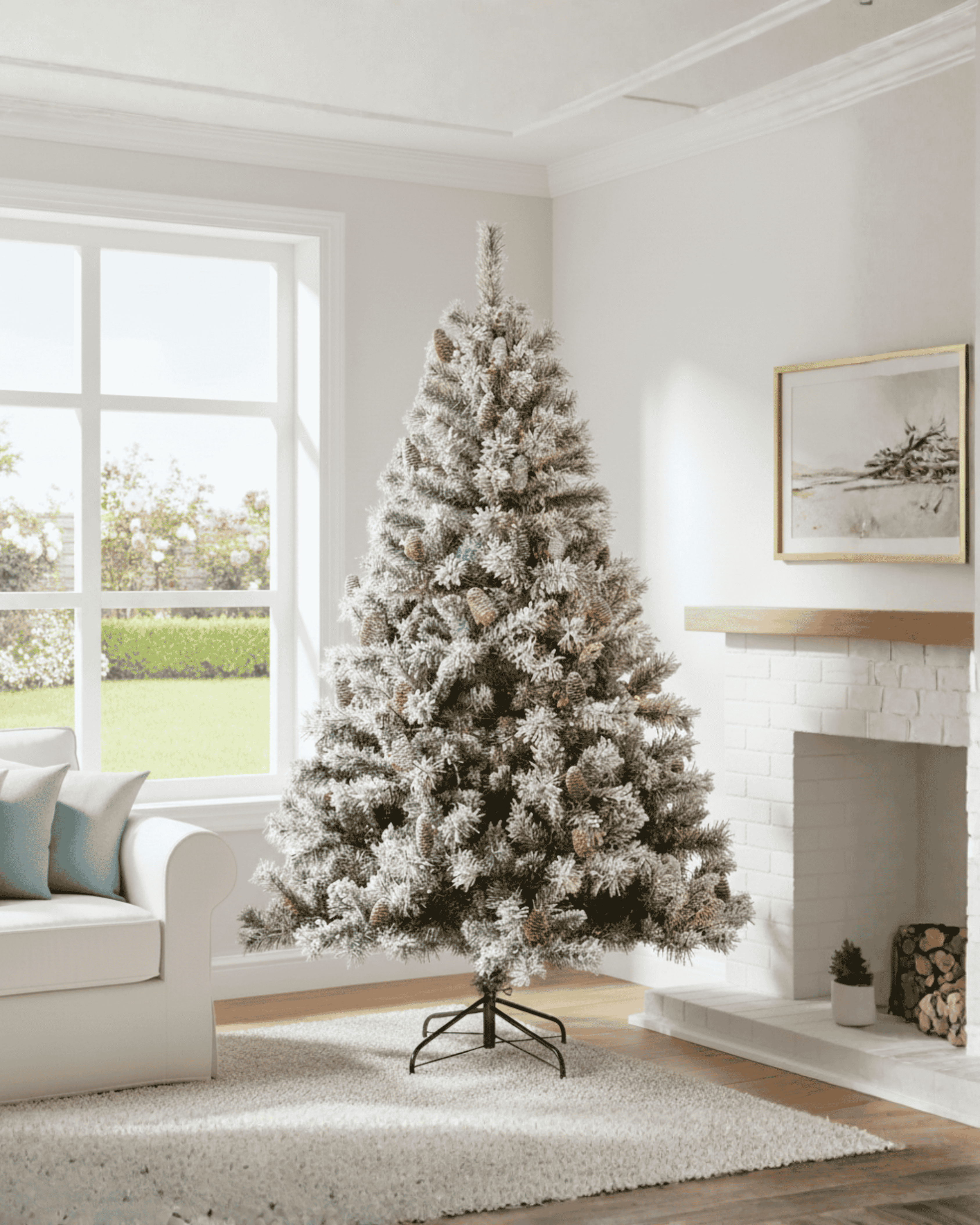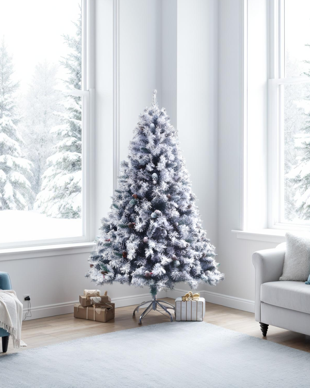 Embrace a wintry look with snowy flocked designs. Perfect for creating a magical festive backdrop in your living room without the upkeep of a real tree.