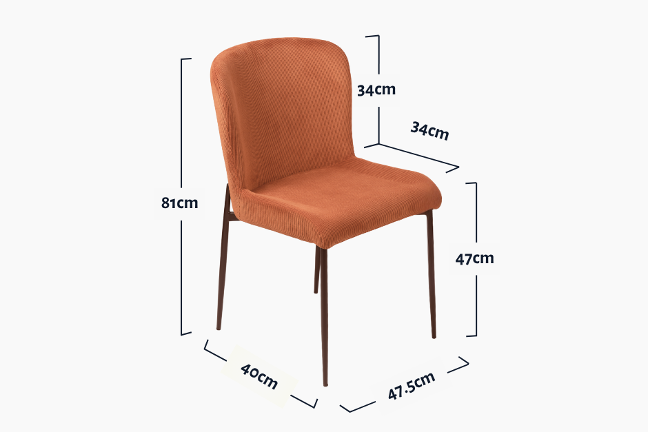 Wrapped in premium corduroy made from 100% recycled PET yarns, these rust-orange coloured dining chairs offer durability and a luxurious touch.
