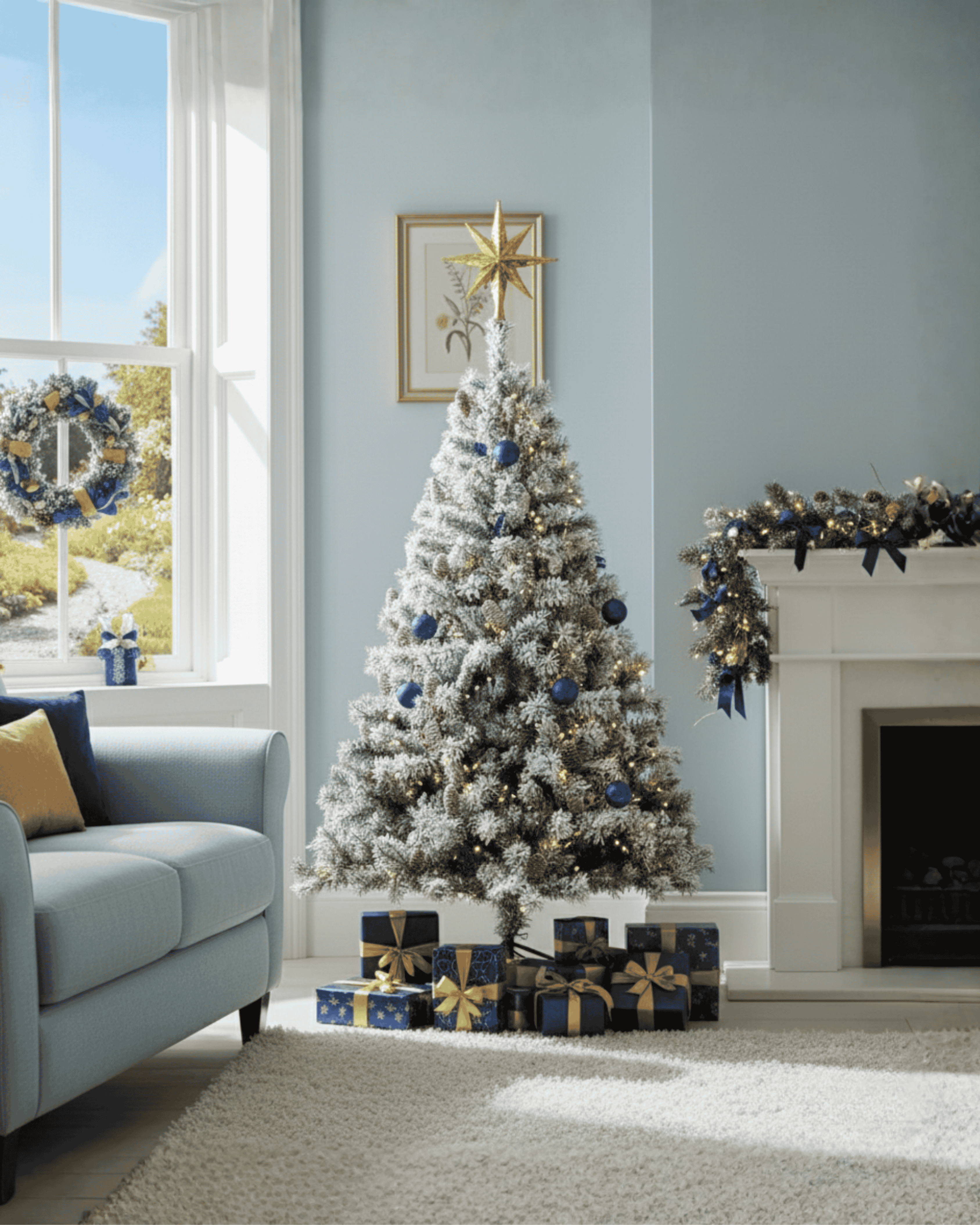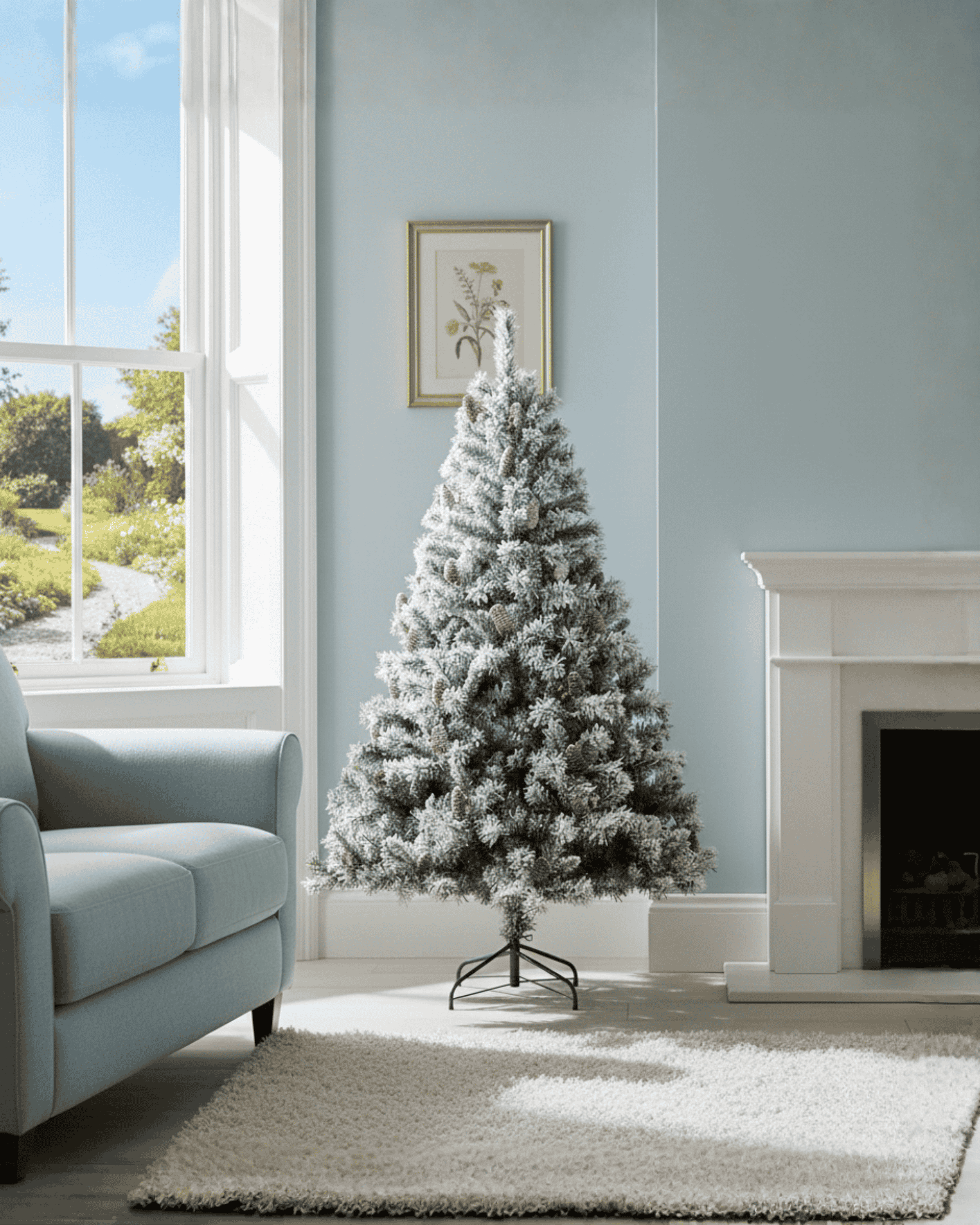 - Luxurious artificial Christmas tree with realistic snow, pinecones, and berries for a festive wintry feel