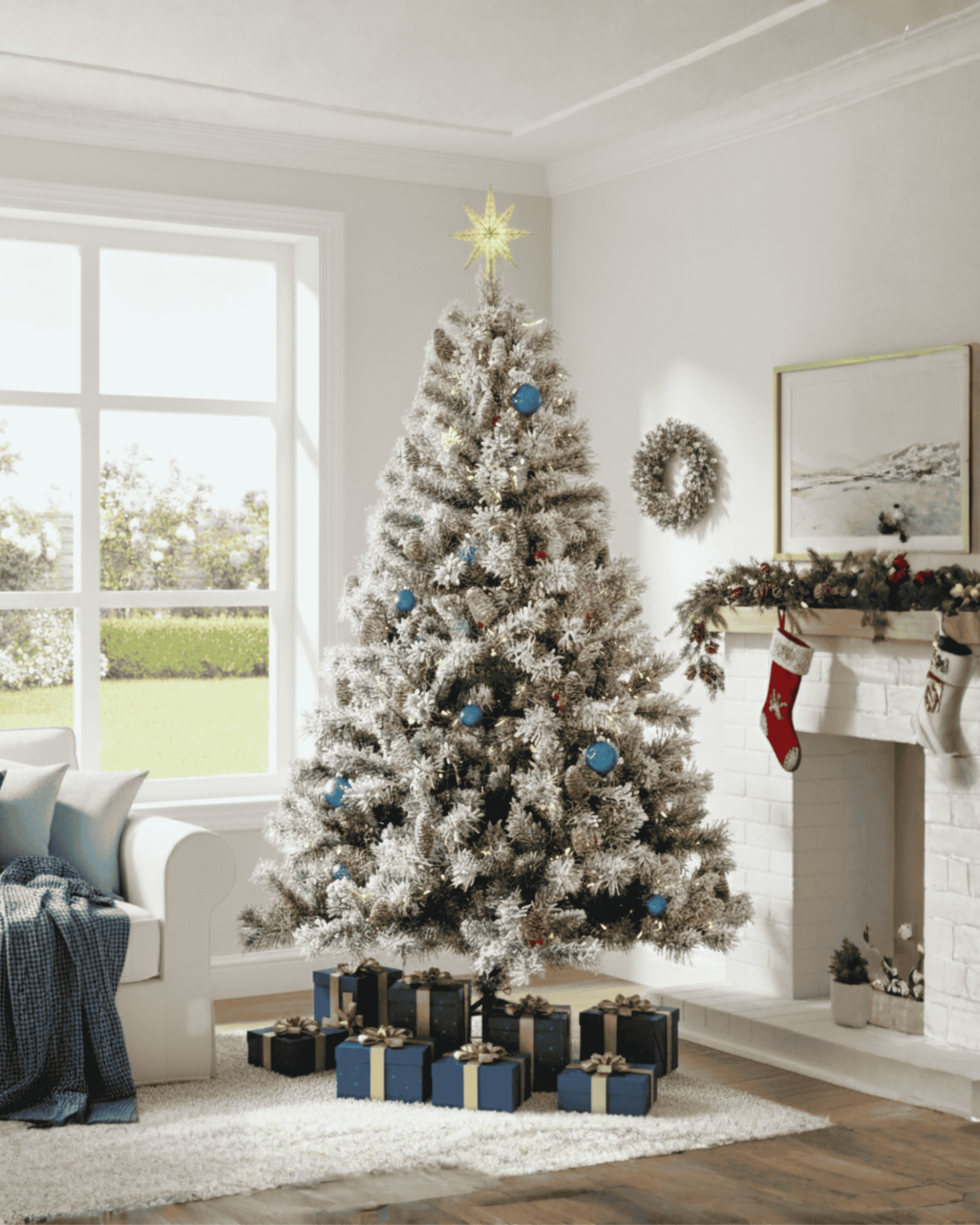 - Luxurious white Christmas tree with realistic snow, pinecones, and berries