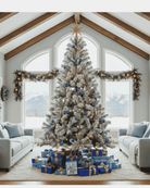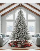 Bring the essence of winter indoors with our snow flocked artificial 8ft Christmas tree. This snowy 8ft Christmas tree blends the snowy charm of winter and the warmth of fall with pinecones and berries.