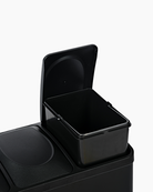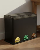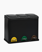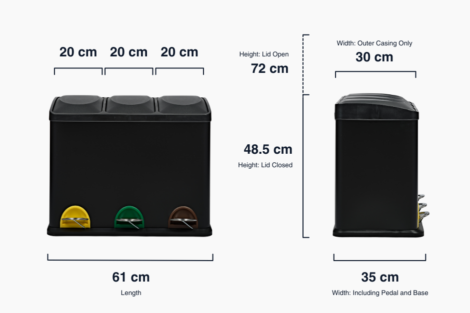 Our 3 compartment Recycling Bin with lid comes with a 45L capacity, split between three 15L easily removable compartments. This 45L large bin is equipped with a stainless steel exterior and a black non-slip base.
