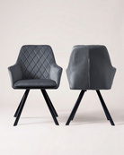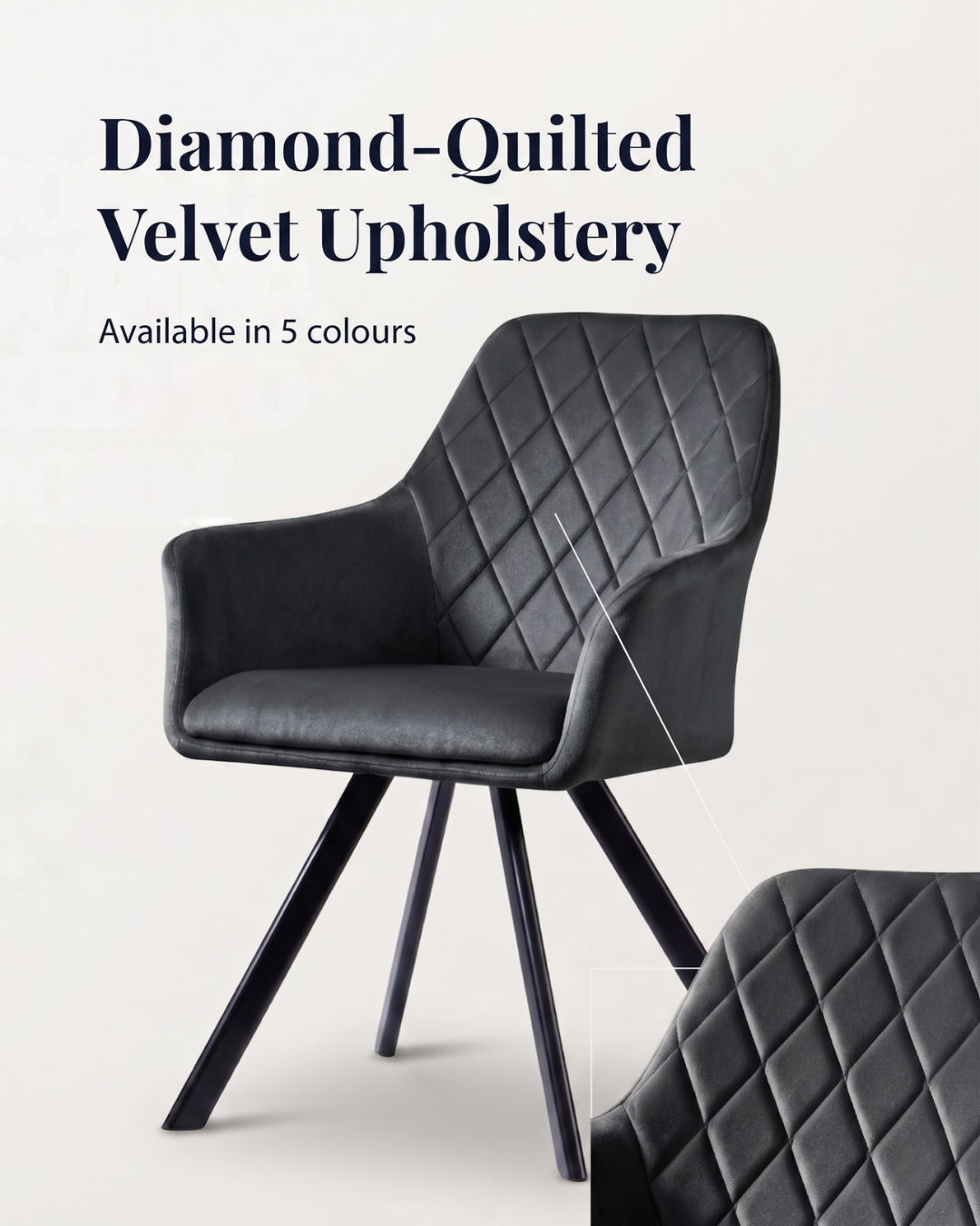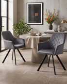This beautifully designed pair of quilted dining chairs offer a stunning look to your dining space Upholstered in lush grey velvet and supported by sturdy black metal legs, the Mason dining chair is an elegant and chic piece of furniture that seamlessly combines sophistication with unparalleled relaxation.