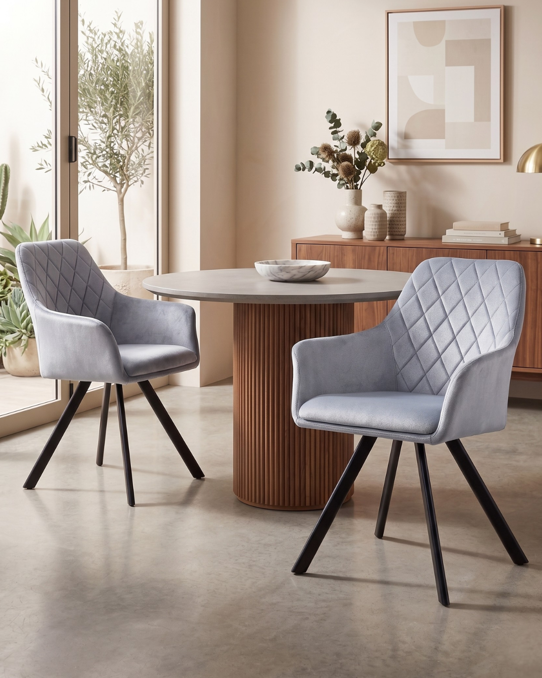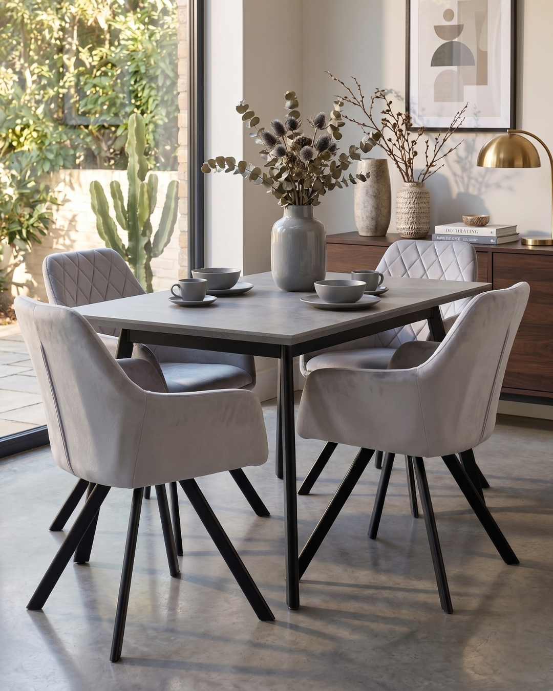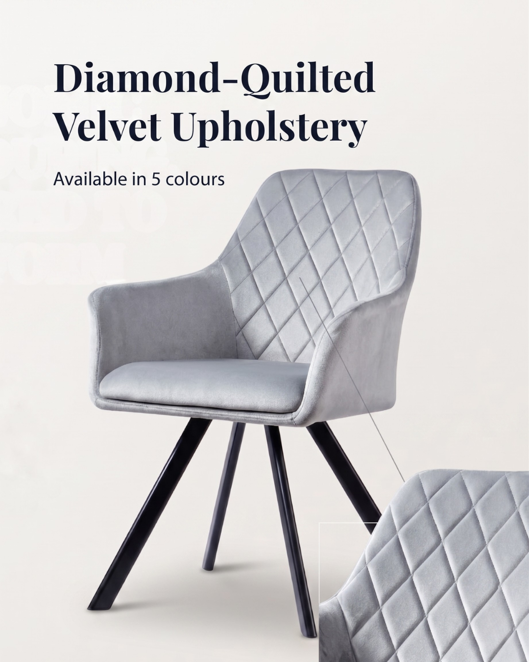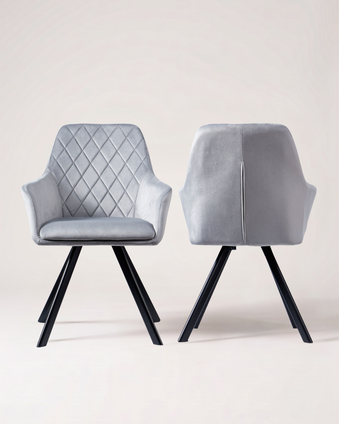 Sink into softness; the quilted dining chair redefines modern elegance. Featuring a silver grey velvet upholstered cushioned seat, this silver grey dining chair offers both support and comfort, while the slim, black powder-coated metal legs that angle outward slightly from a central base ensures stability.